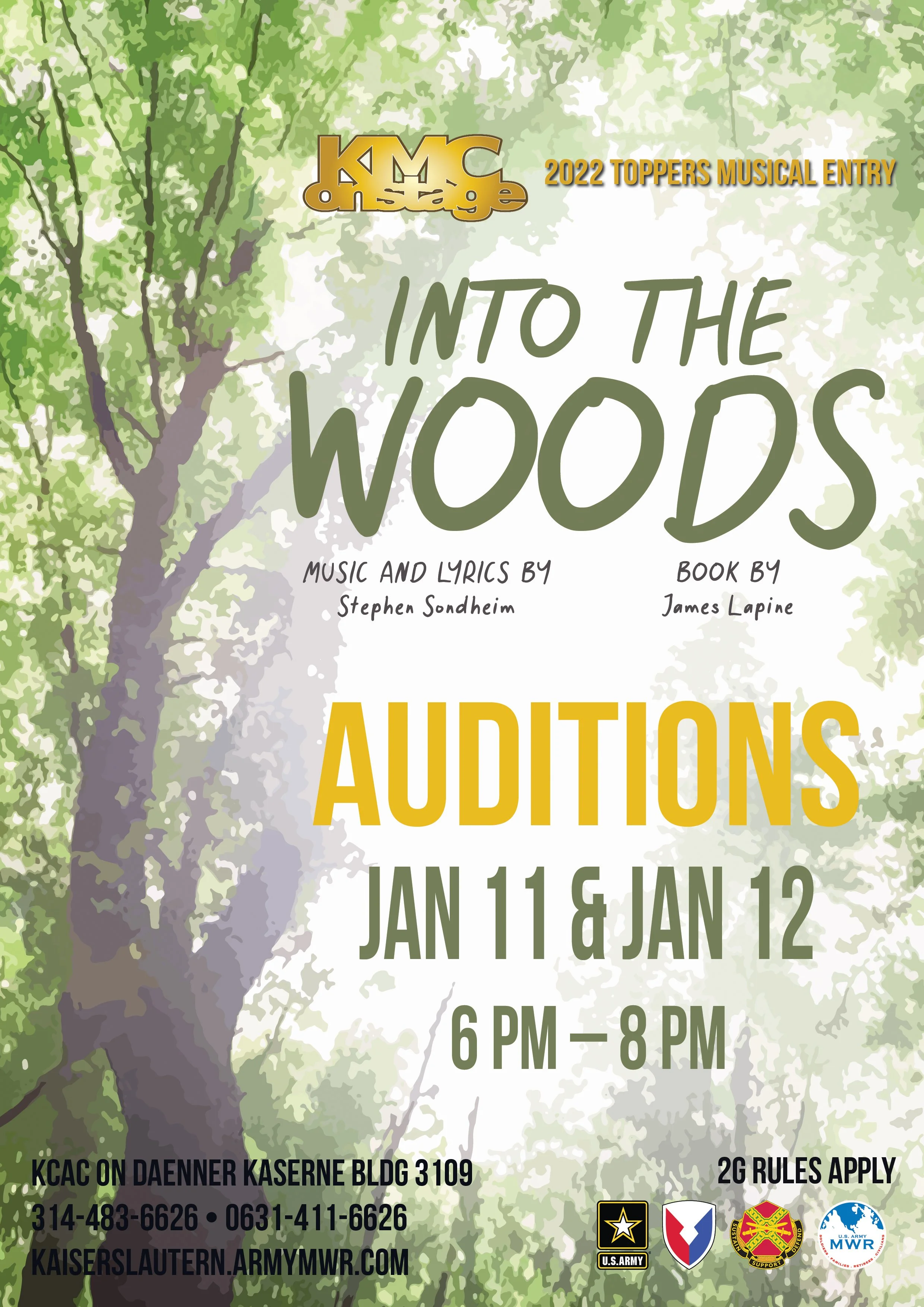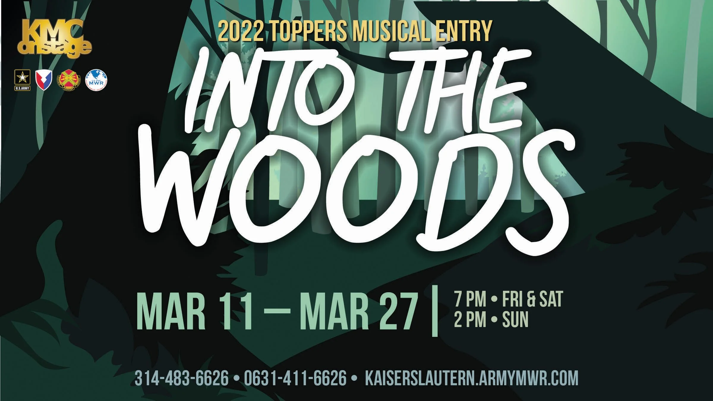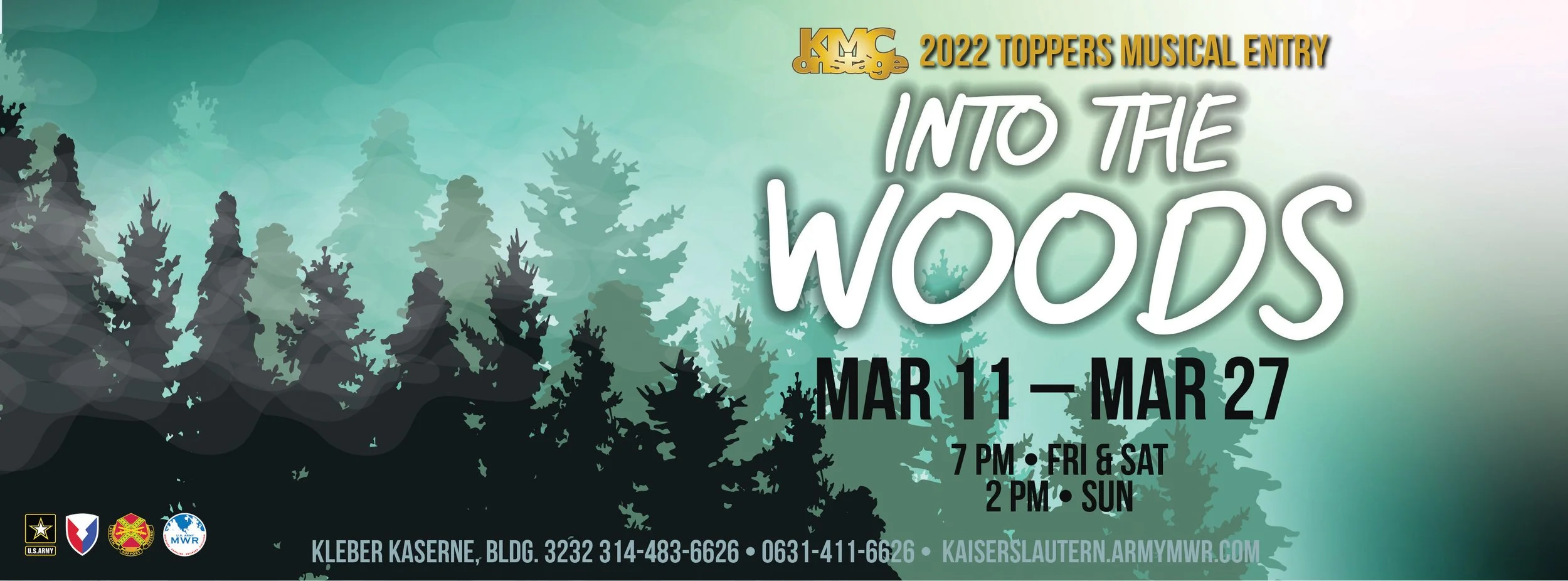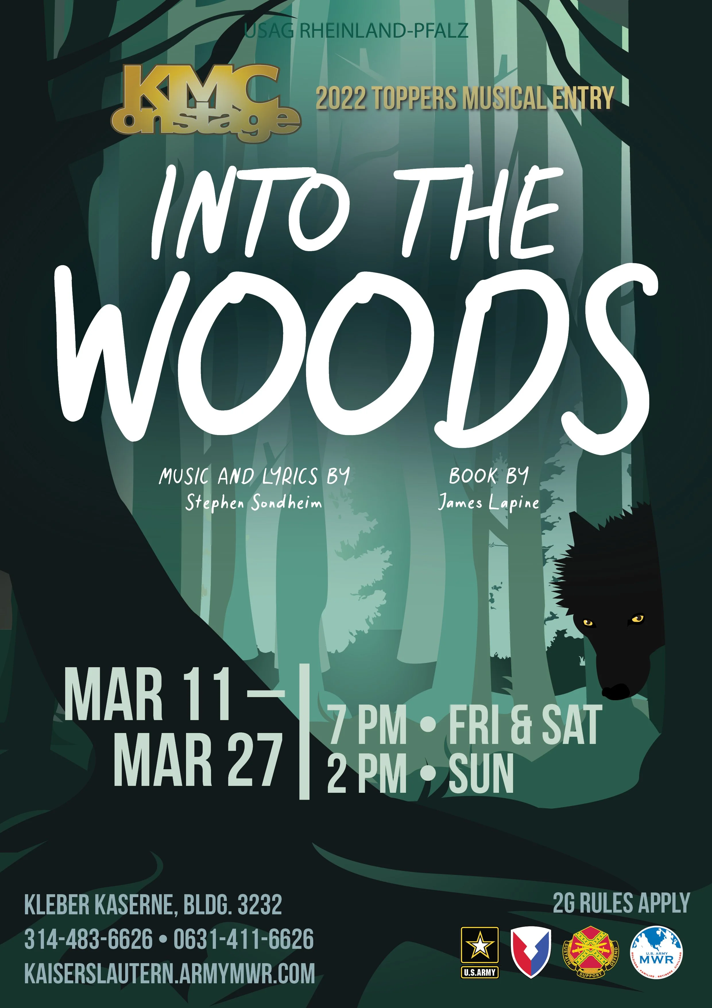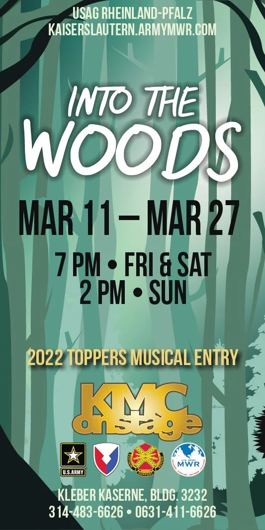 Marketing requested the poster be designed on A4 (210mm x 297mm) so it could be scaled up or down and to fit several sizes (A5, A1, A2, etc). The poster needed to have the show dates, the music composer and book writer, the location, the phone number for the box office, the Covid restrictions, MWR logos, and the theatre’s logo along with the line about the show being a “2022 Toppers Entry.”